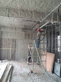 致靜好聲音無機纖維噴涂由無機纖維與水基型膠粘劑組成,經拌和后通過空壓泵進行噴涂,與霧化水混合噴到需要